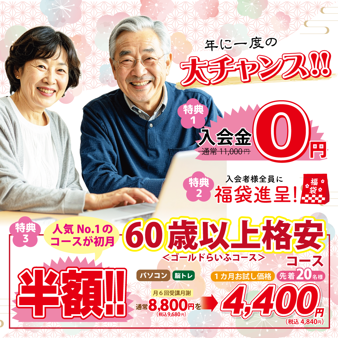 1/6(月)から新春キャンペーンを実施いたします。入会金無料など、この期間だけのお得な特典をご用意しておりますので、2025年にPCらいふパソコンスクールでパソコンスキルを身につけましょう。